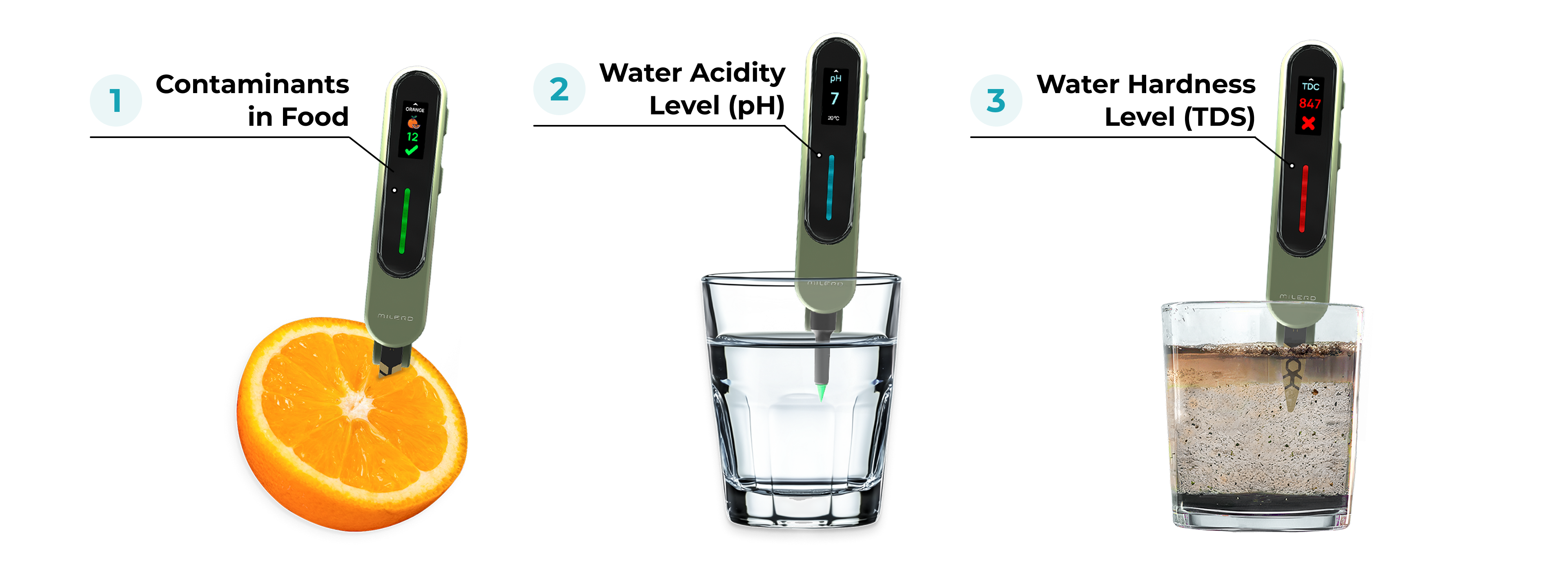 3-in-1-Sicherheitsgerät. Scannt Lebensmittel auf Schadstoffe (wie Nitrate, Pestizide) und testet Wasser auf TDS und pH-Wert – alles mit einem einzigen Gerät.