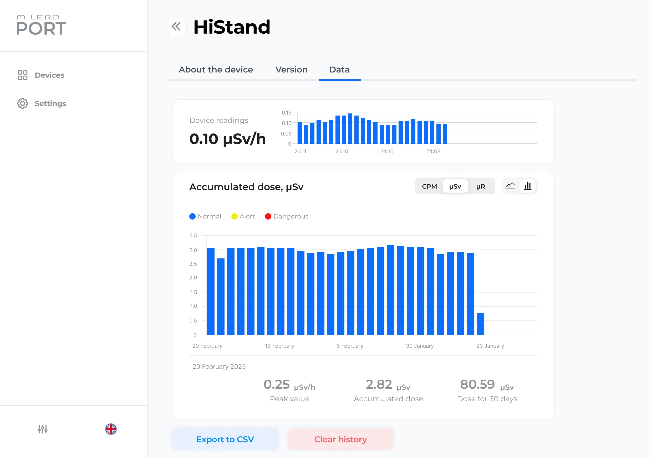 The application currently supports the Milerd HiStand (Geiger counter) and Milerd HiRange (EMF meter). Support for additional Milerd devices will be available soon.
